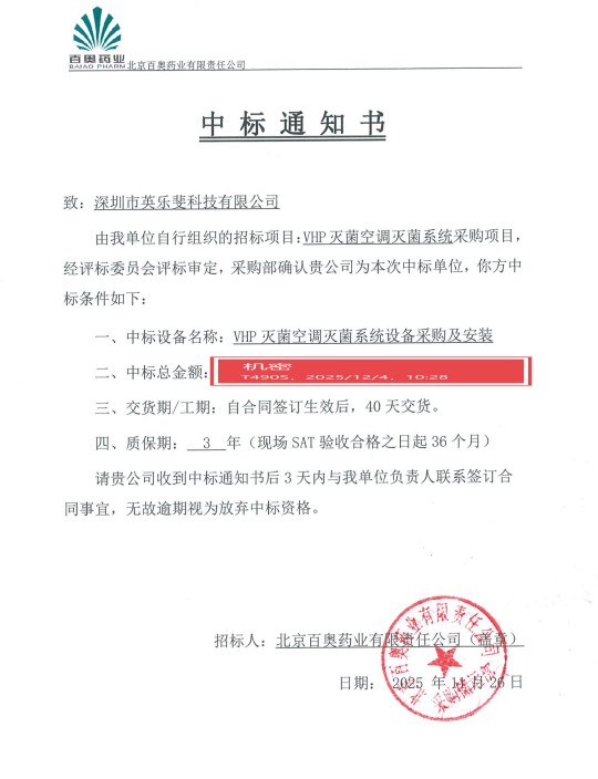 喜讯!英乐斐科技中标北京百奥药业 VHP 空调灭菌系统项目